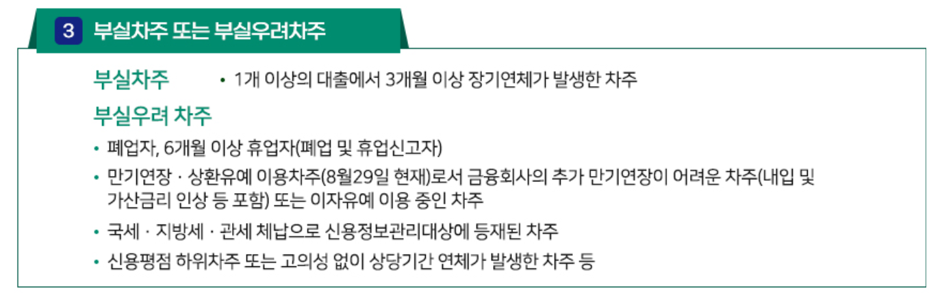 - 부실 우려차주(만기연장, 상환유예를 이용하는 차주중 만기 연장이 어렵거나 이자 유예하는 경우)