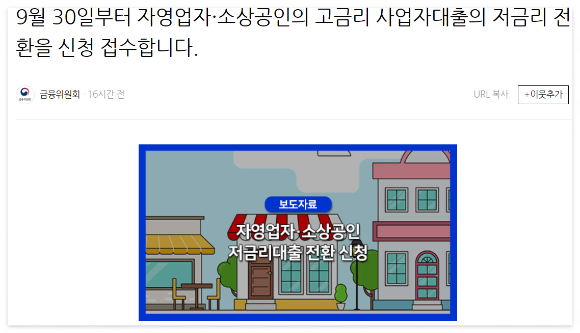 또한 연 7%이상 고금리 사업자 대출을 저금리 대출로 전환해주는 프로그램 접수는 30일부터 시작되니 관련 내용 확인해보세요~
