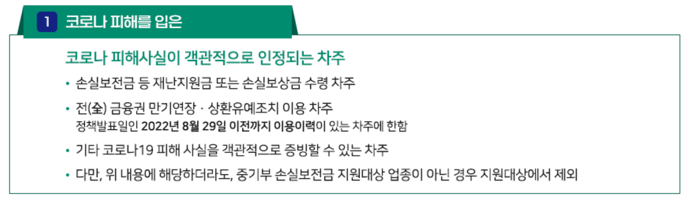 고의 연체자, 고액 자산가가 소규모 채무 감면 위해 신청하는 경우, 코로나 피해와 무관한 경우, 부동산 임대 매매업과 같은 개인 자산형성 목적의 가계대출, 전세보증 대출하는 경우, 할인어음, 무역금융 등 기타 처분에 제한이 있는 대출받은 자, 법원 회생절차 진행 중인 자