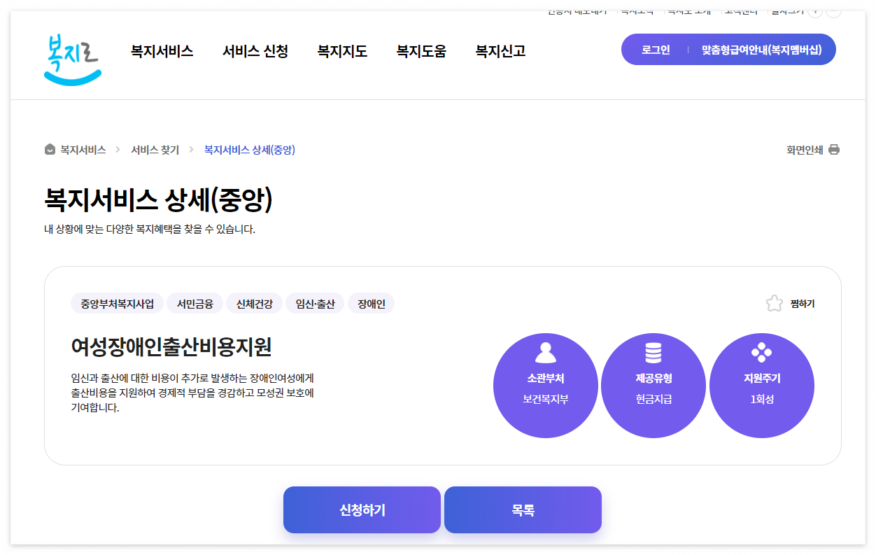 ② 온라인 신청의 복지 서비스 → 여성장애인 출산비용 지원 선택