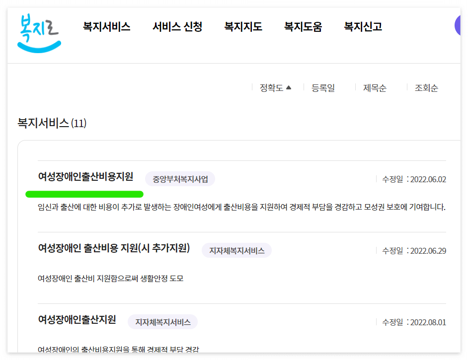 ★메뉴가 찾기 힘드시면 홈페이지 첫 화면 검색바에 여성장애인 출산비용 지원을 입력 후 검색하시면 됩니다.