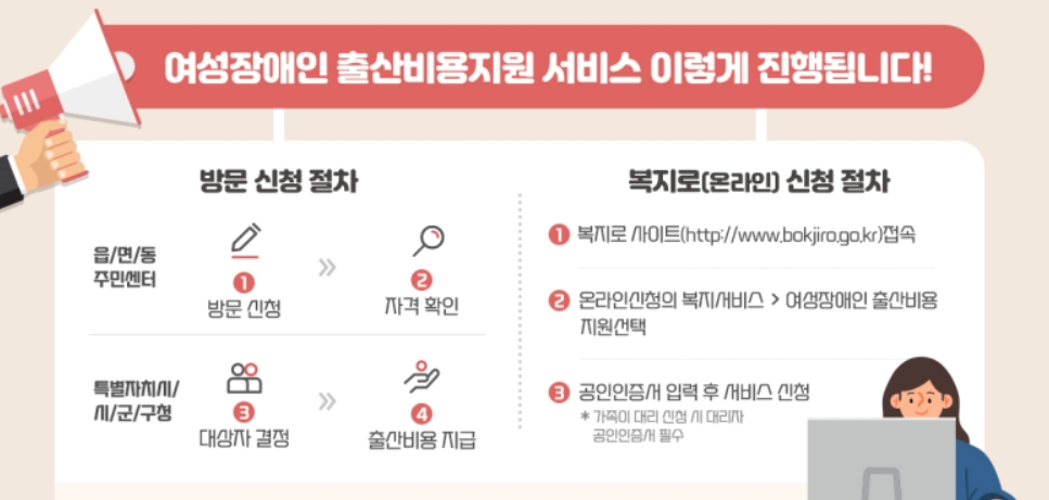 출산을 할 때 여성장애인의 경제적 부담을 줄이고자 여성장애인 출산비용 지원 서비스를 지원하는 제도가 있어요.