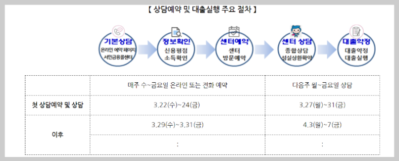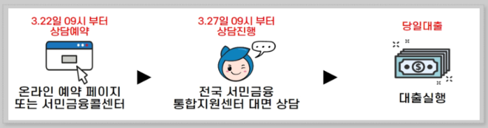 서민금융진흥원 온라인 예약 페이지 혹은 서민금융 콜센터 (1397) 연결을 통해 상담 예약이 우선적으로 필요하며,이후 3월 27일 오전 9시부터 전국 서민금융통합지원센터에서의 대면 상담이 진행될 예정입니다.